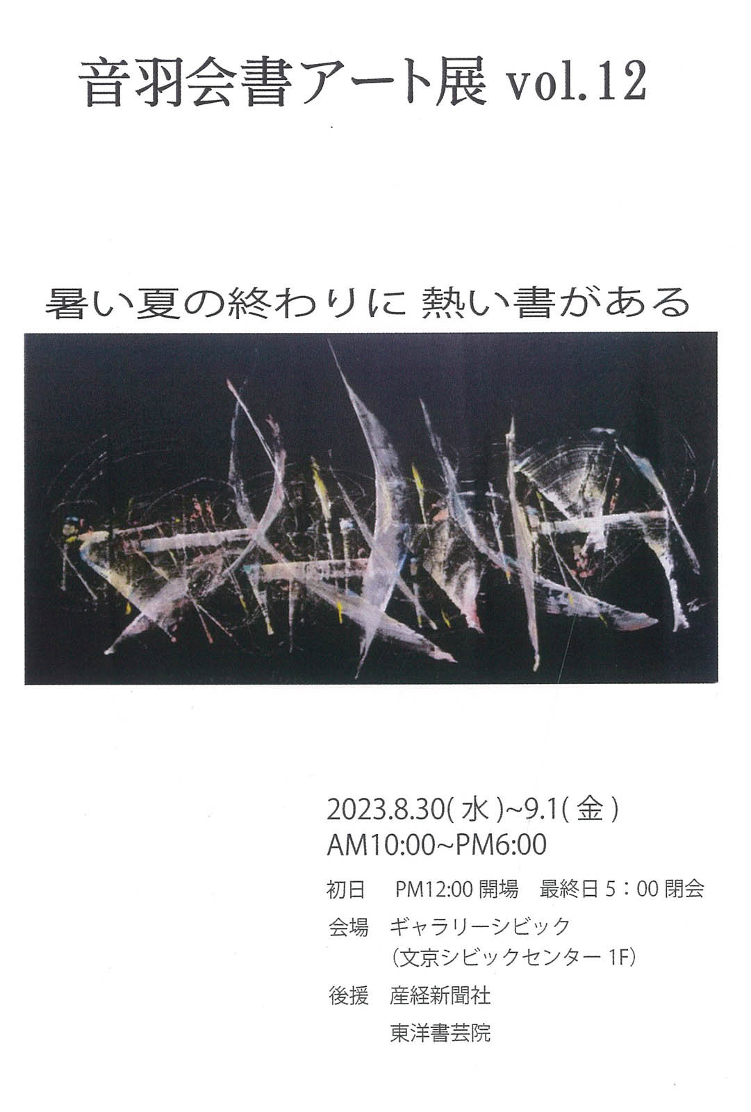 | 展覧会名 会期 会場 団体・代表名 | 音羽会書アート展 vol.12 8月30日(水)~9月1日(金) 文京ギャラリーシビック 音羽書アートの会・諸留大穹 |