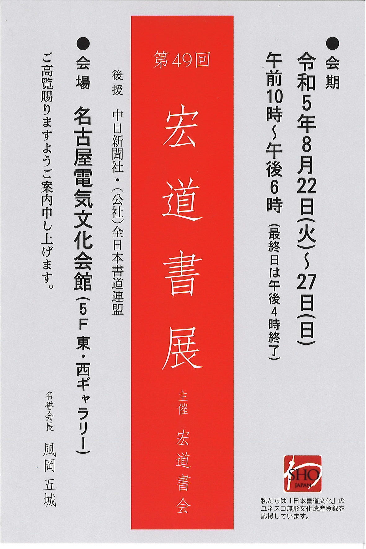 | 展覧会名 会期 会場 団体・代表名 | 第49回宏道書展 8月22日(火)~8月27日(日) 名古屋電気文化会館ギャラリー 宏道書会・山本晴城 |