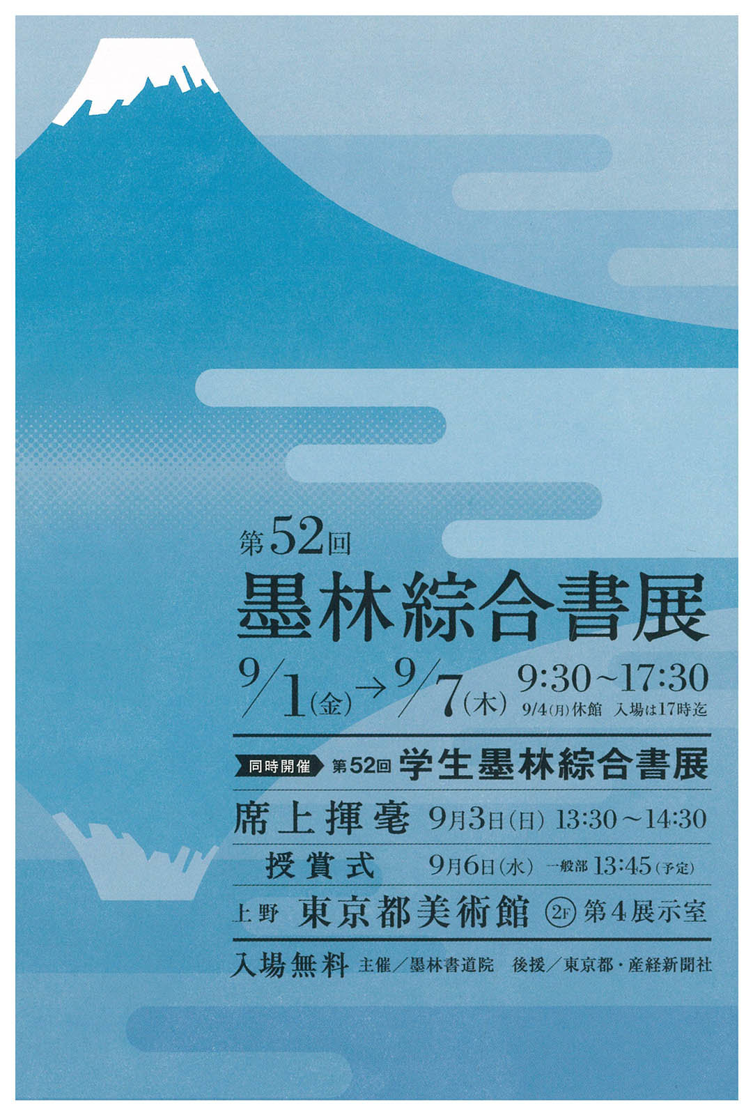 | 展覧会名 会期 会場 団体・代表名 | 第52回墨林綜合書展・学生墨林綜合書展 9月1日(金)~9月7日(木) 東京都美術館 墨林書道院・遠藤乾翠 |
