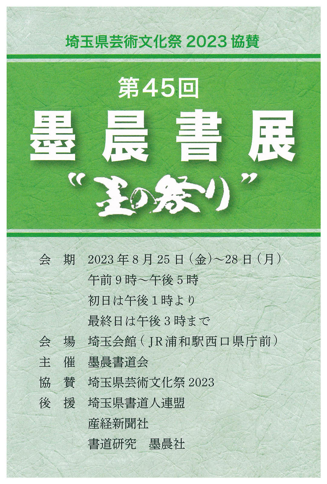 | 展覧会名 会期 会場 団体・代表名 | 第45回墨晨書道会展 “墨の祭り” 8月25日(金)~8月28日(月) 埼玉会館 墨晨書道会・岩田正直 |