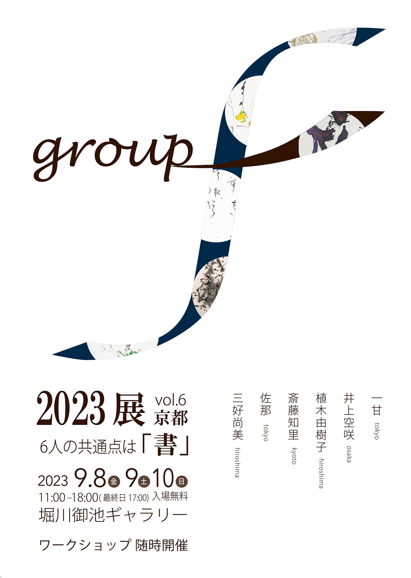 | 展覧会名 会期 会場 団体・代表名 | groupF 2023展 Vol.6 京都~新たな可能性を求めてから 9月8日(金)~9月10日(日) 堀川御池ギャラリー groupF・井上空咲 |