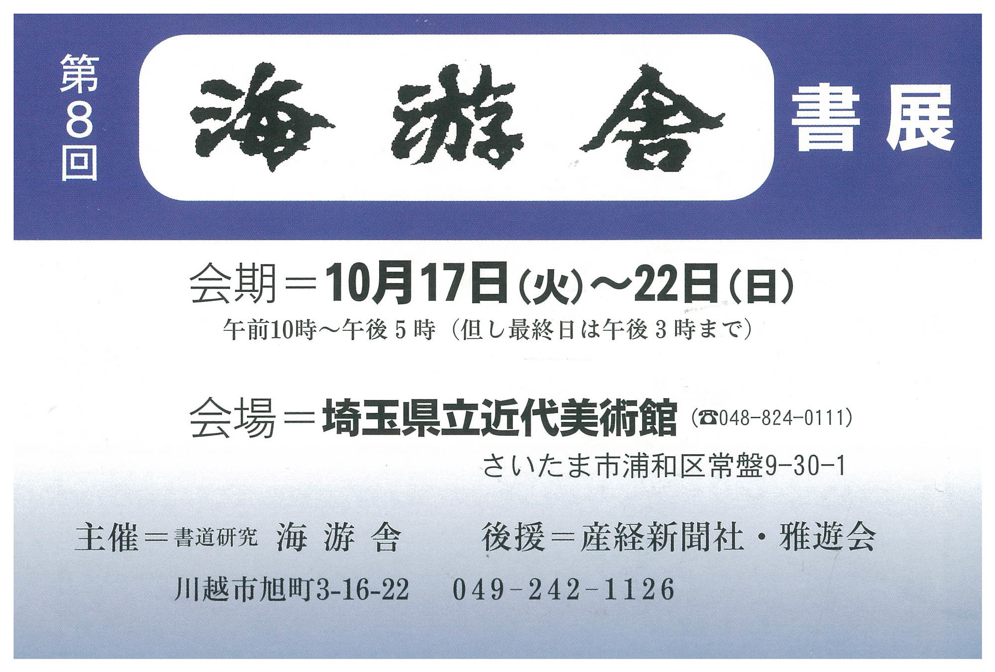 | 展覧会名 会期 会場 団体・代表名 | 第8回海游舎書展 10月17日(火)~10月22日(日) 埼玉県立近代美術館 海游舎・山下海堂 |