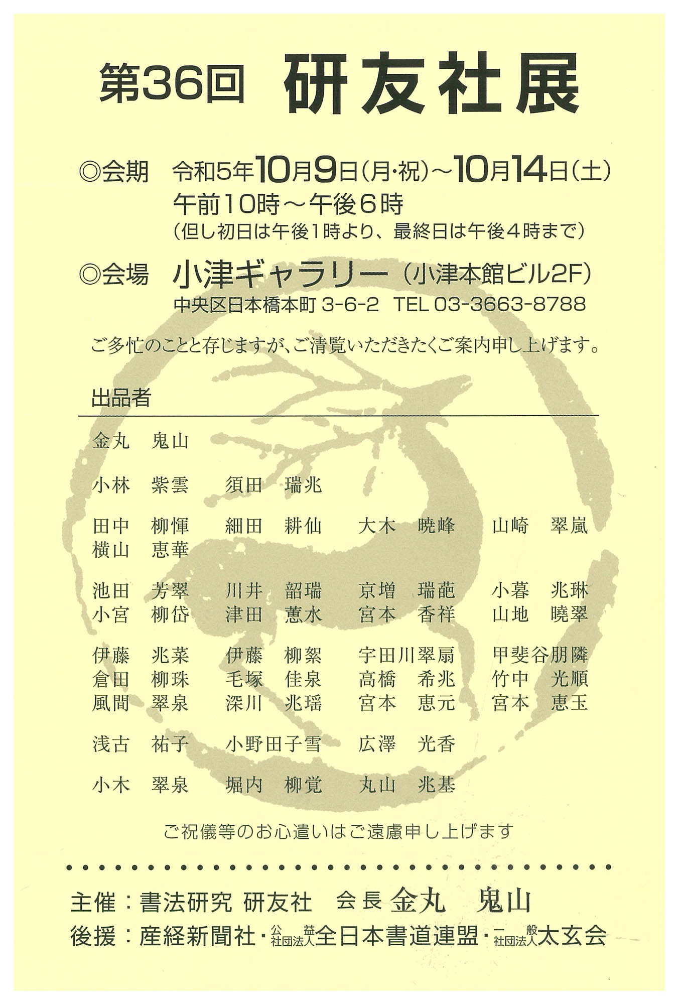 | 展覧会名 会期 会場 団体・代表名 | 第36回研友社展 10月9日(月)~10月14日(土) 小津ギャラリー 研友社・金丸鬼山 |
