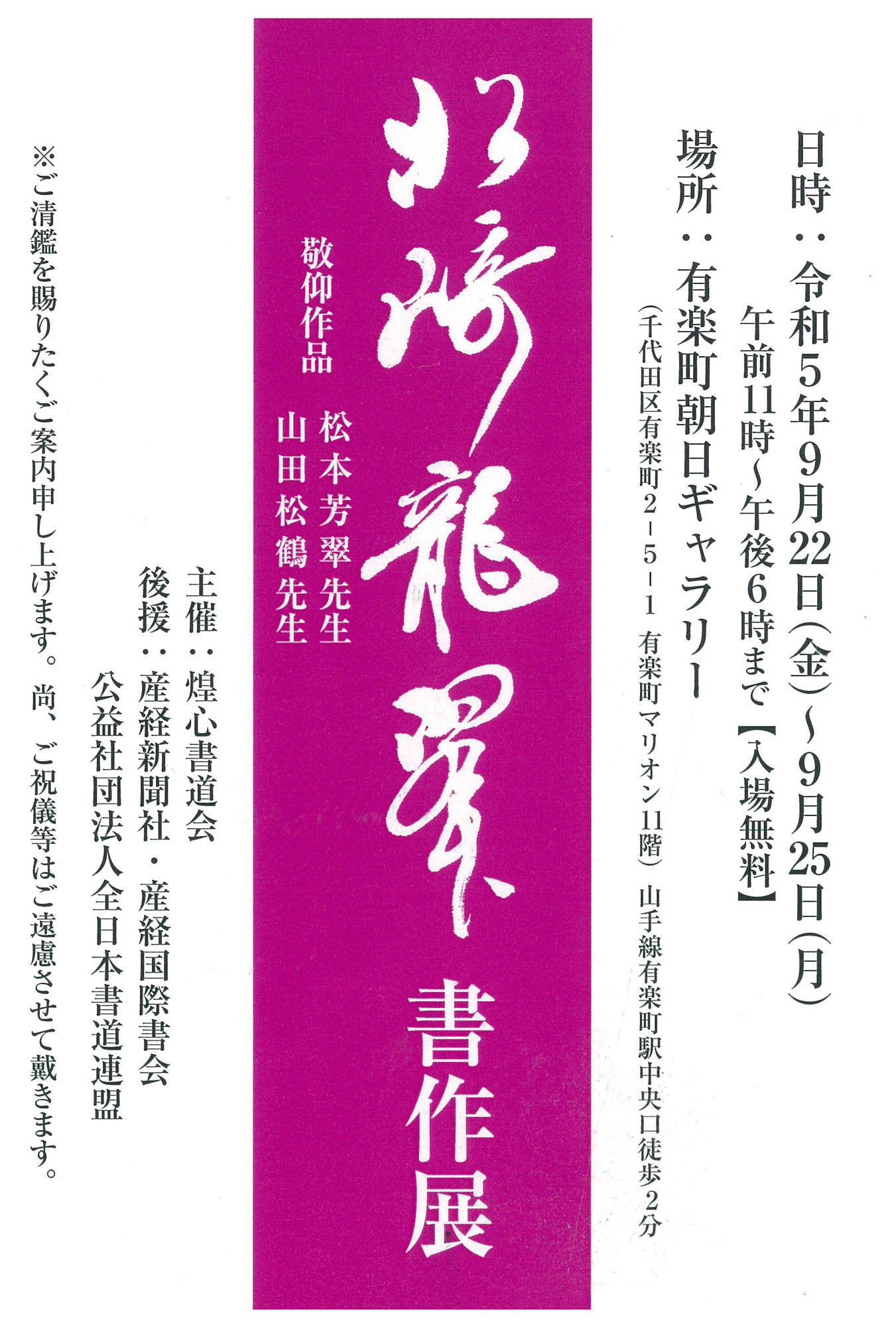 | 展覧会名 会期 会場 団体・代表名 | 第48回煌心同人書展 10月19日(木)~10月22日(日) 銀座かねまつホール 煌心書道会・松﨑龍翠 |