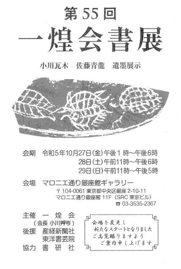 | 展覧会名 会期 会場 団体・代表名 | 第55回一煌会書展 10月27日(金)~10月29日(日) マロニエ通り銀座館ギャラリー 一煌会・小川艸岑 |