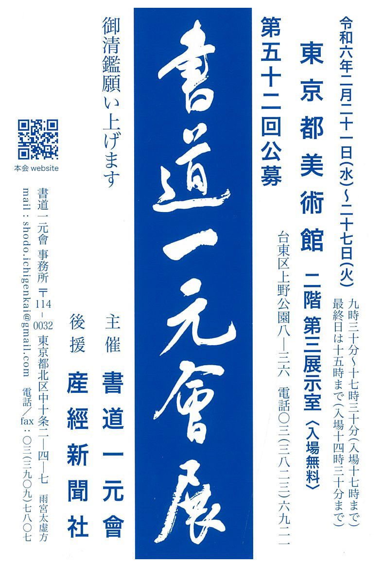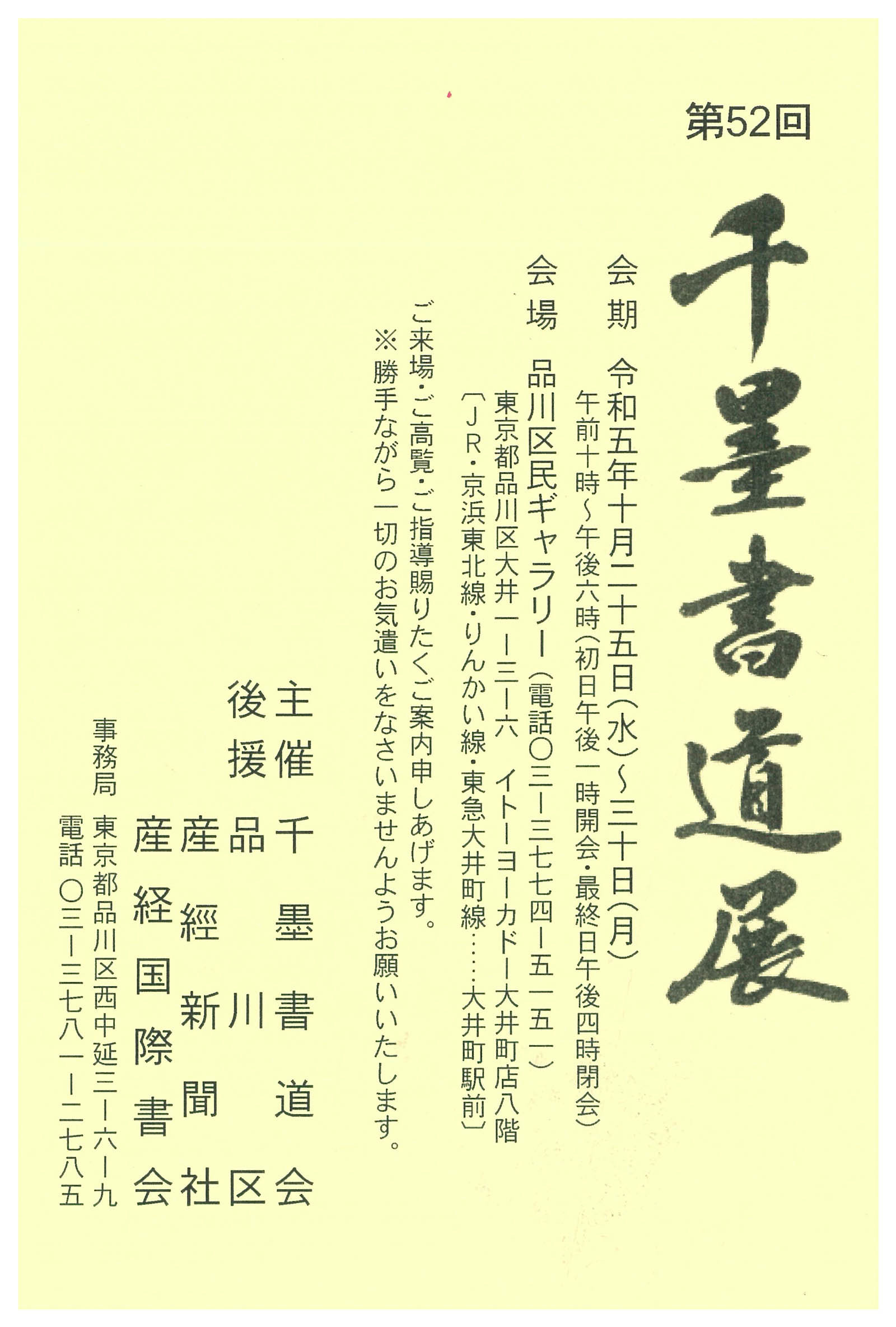 | 展覧会名 会期 会場 団体・代表名 | 第52回千墨書道展 10月25日(水)~10月30日(月) 品川区民ギャラリー 千墨書道会・近藤豊泉 |