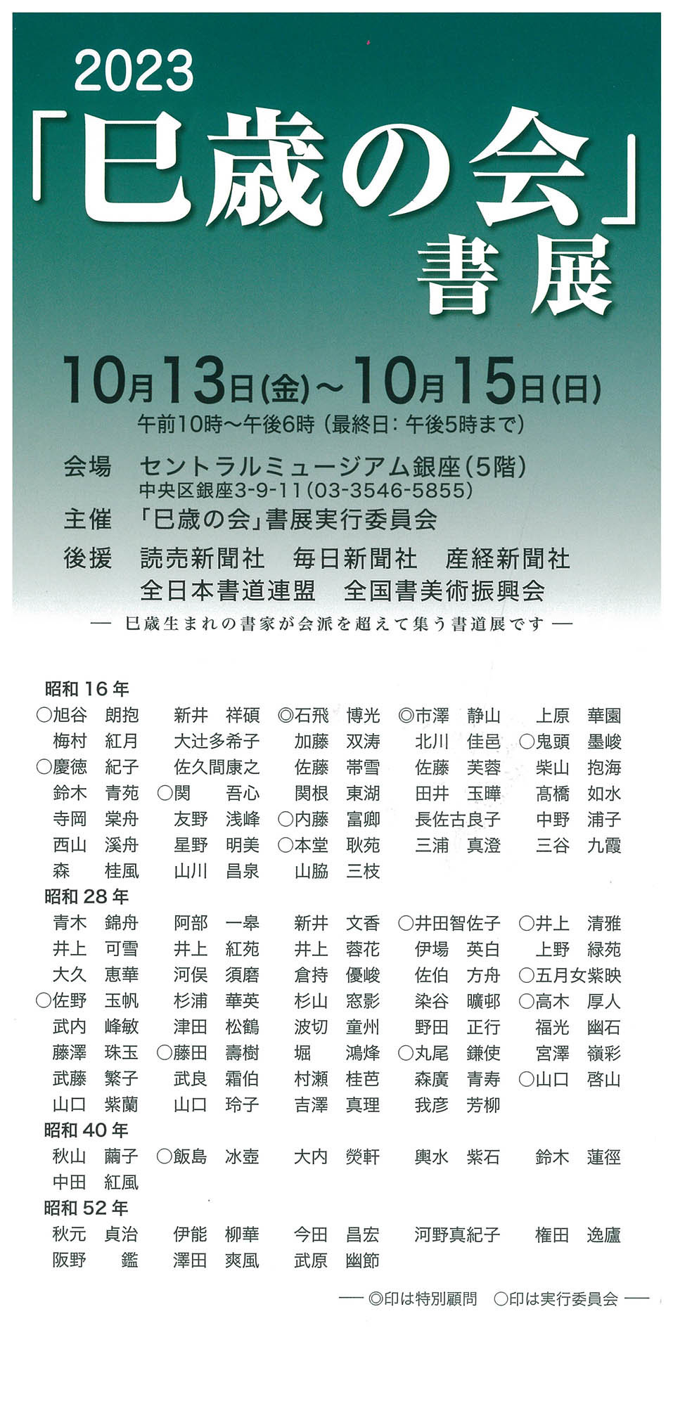 | 展覧会名 会期 会場 団体・代表名 | 2023「巳歳の会」書展 10月13日(金)~10月15日(日) セントラルミュージアム銀座 「巳歳の会」書展実行委員会 |
