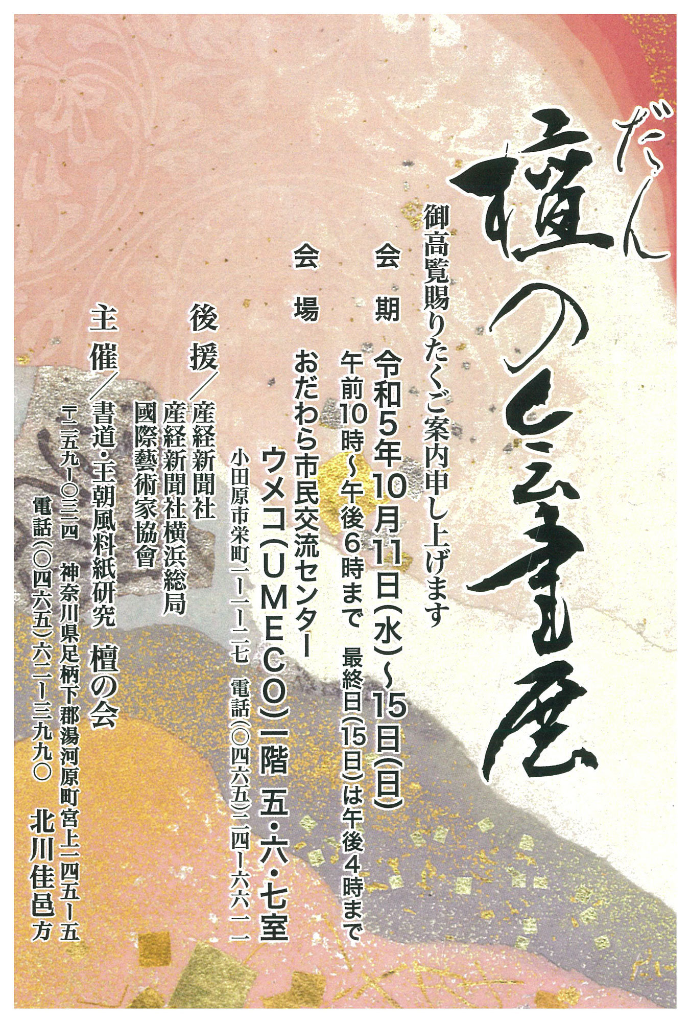| 展覧会名 会期 会場 団体・代表名 | 檀の会書展 10月11日(水)~10月15日(日) おだわら市民文化センターUMECO 檀の会・北川佳邑 |