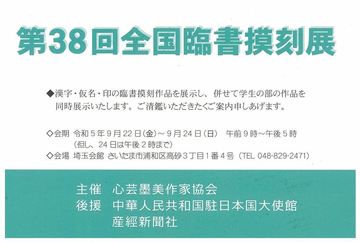 | 展覧会名 会期 会場 団体・代表名 | 第38回全国臨書摸刻展併催学生展 9月22日(金)~9月24日(日) 埼玉会館 心芸墨美作家協会・岩浅写心 |