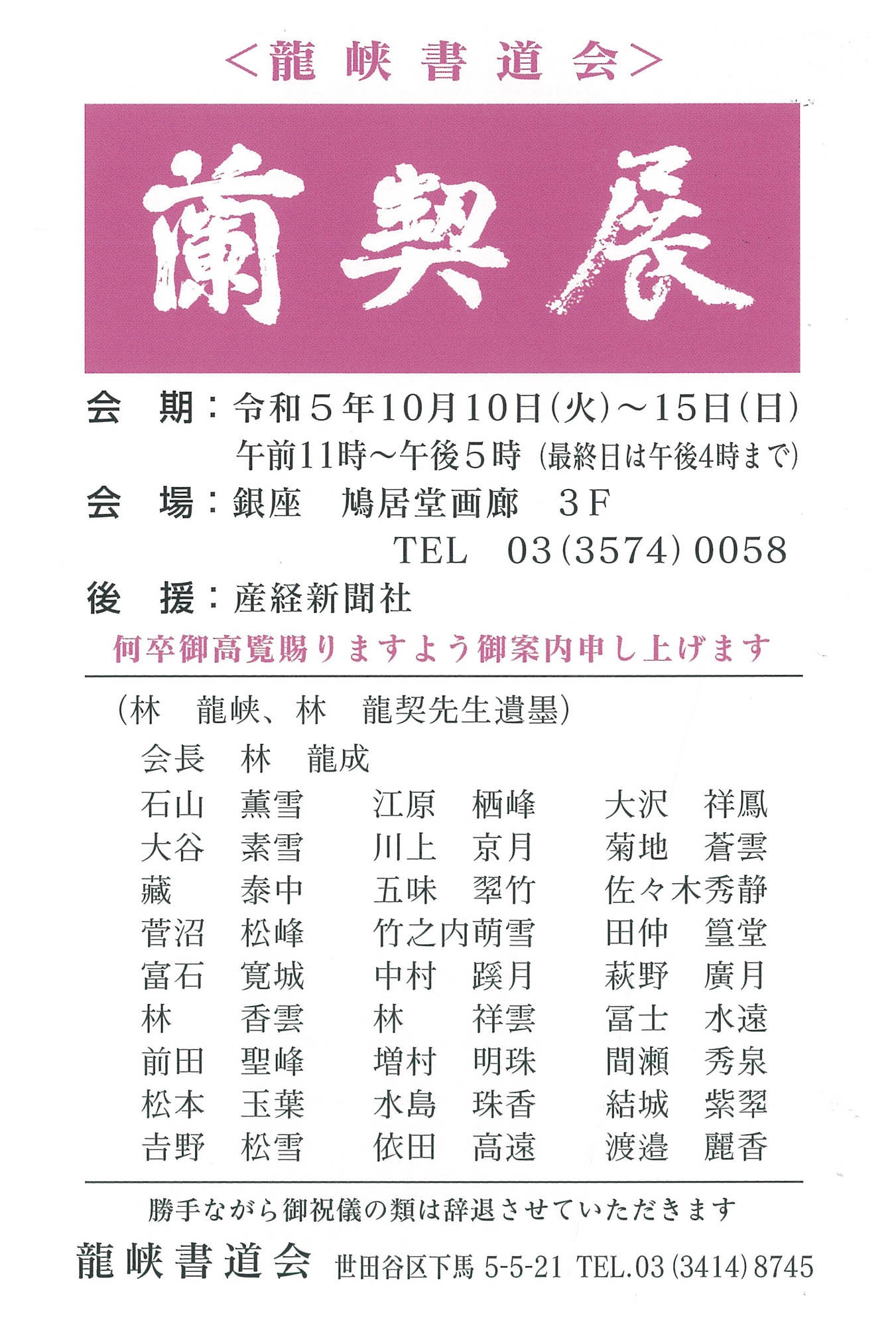 | 展覧会名 会期 会場 団体・代表名 | 第29回蘭契展 10月10日(火)~10月15日(日) 銀座鳩居堂ギャラリー 龍峡書道会・林龍成 |