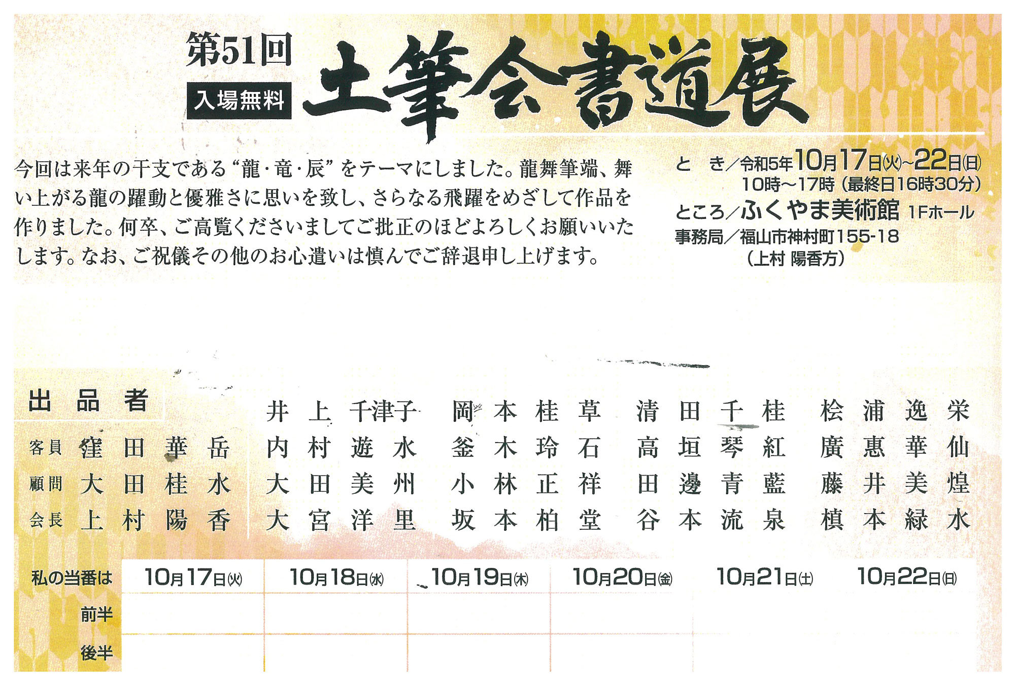 | 展覧会名 会期 会場 団体・代表名 | 第51回土筆会書道展 10月17日(火)~10月22日(日) ふくやま美術館シティーホール 書道研究 土筆会・上村陽香 |