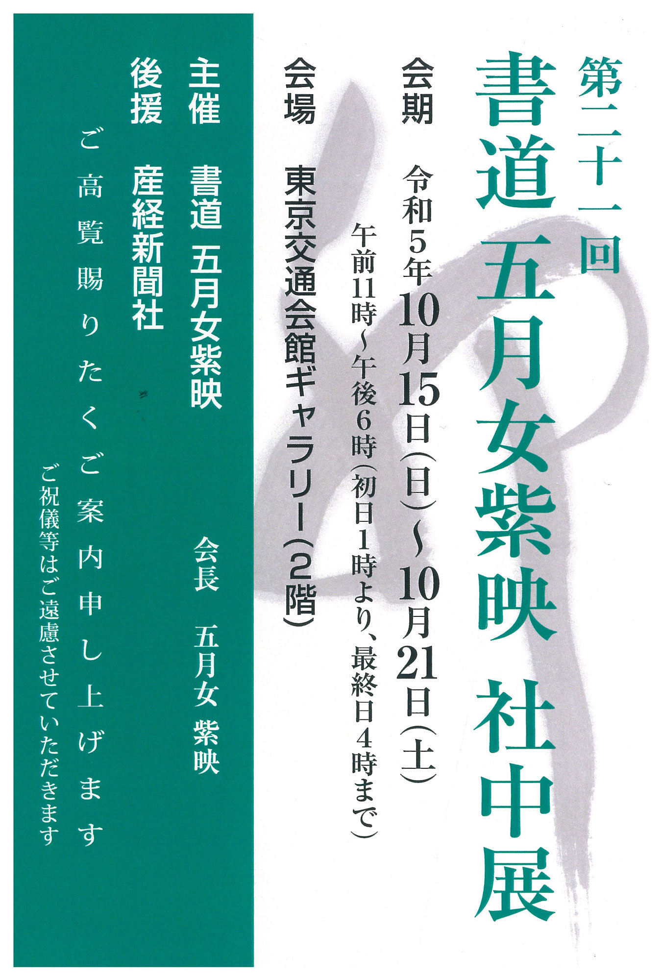 | 展覧会名 会期 会場 団体・代表名 | 第21回書道 五月女紫映 社中展 10月15日(日)~10月21日(土) 東京交通会館ギャラリー 書道 五月女紫映・五月女紫映 |
