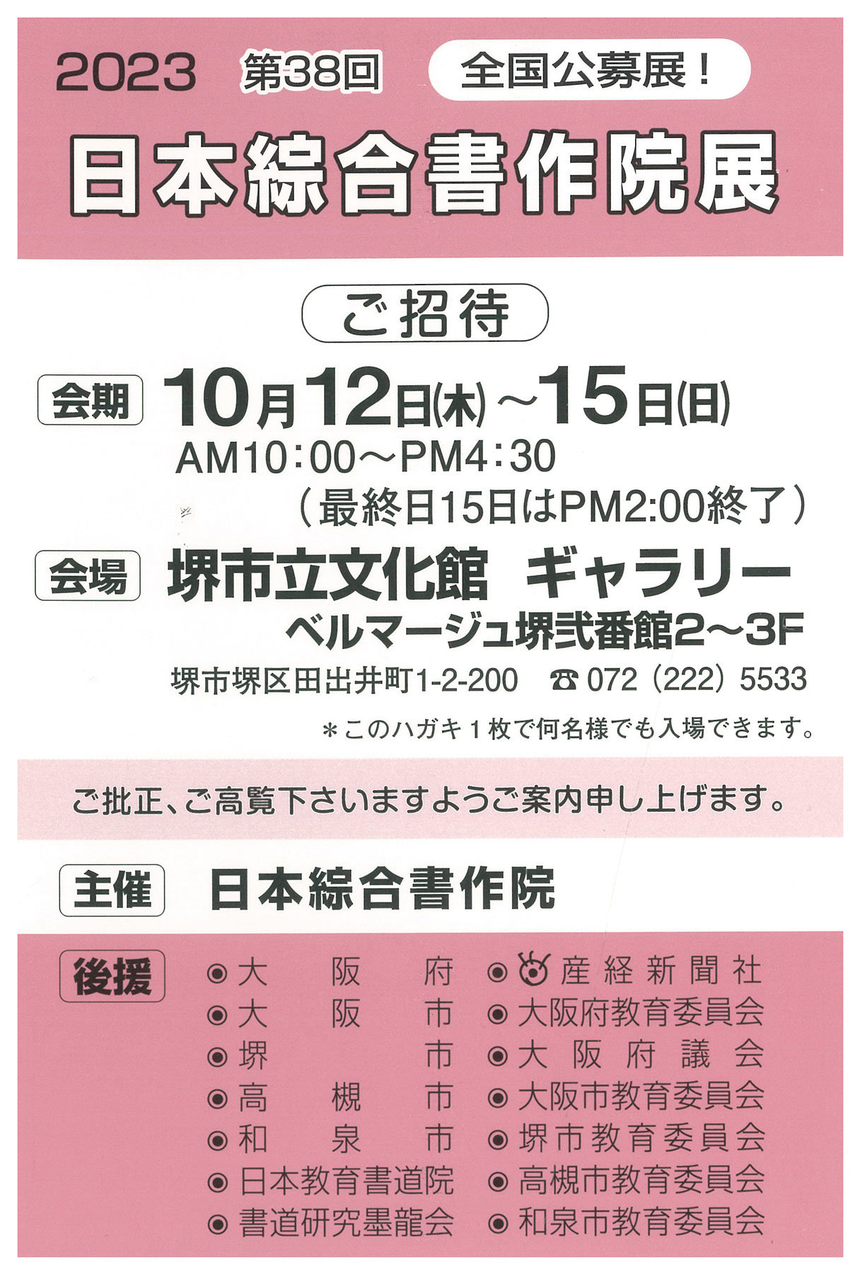 | 展覧会名 会期 会場 団体・代表名 | 第38回日本綜合書作院展 10月12日(木)~10月15日(日) 堺市立文化館 日本綜合書作院・篠原秀朋 |
