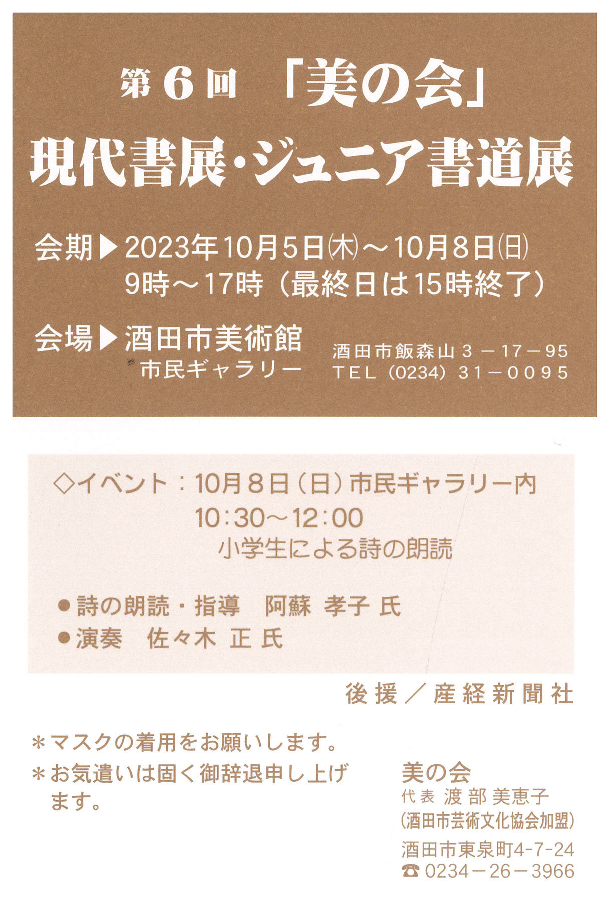 | 展覧会名 会期 会場 団体・代表名 | 第6回「美の会」現代書展・ジュニア書道展 10月5日(木)~10月8日(日) 酒田市美術館市民ギャラリー 美の会・渡部美恵子 |