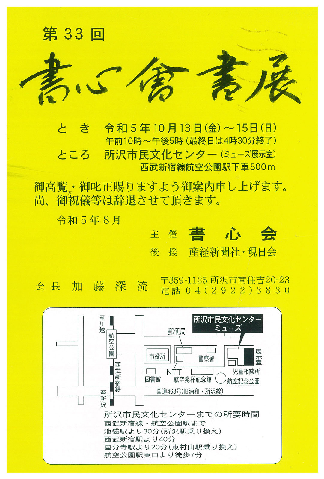 | 展覧会名 会期 会場 団体・代表名 | 第33回書心会書展 10月13日(金)~10月15日(日) 所沢市民文化センター(ミューズ) 書心会・加藤深流 |