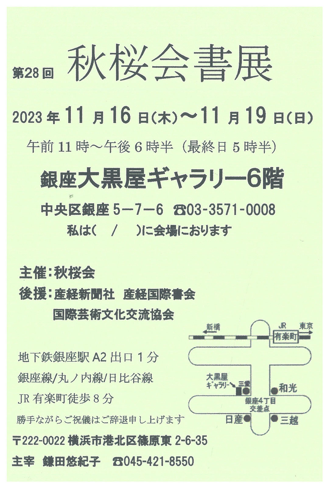 | 展覧会名 会期 会場 団体・代表名 | 第28回秋桜会書展 11月16日(木)~11月19日(日) 銀座大黒屋ギャラリー 秋桜会・鎌田悠紀子 |