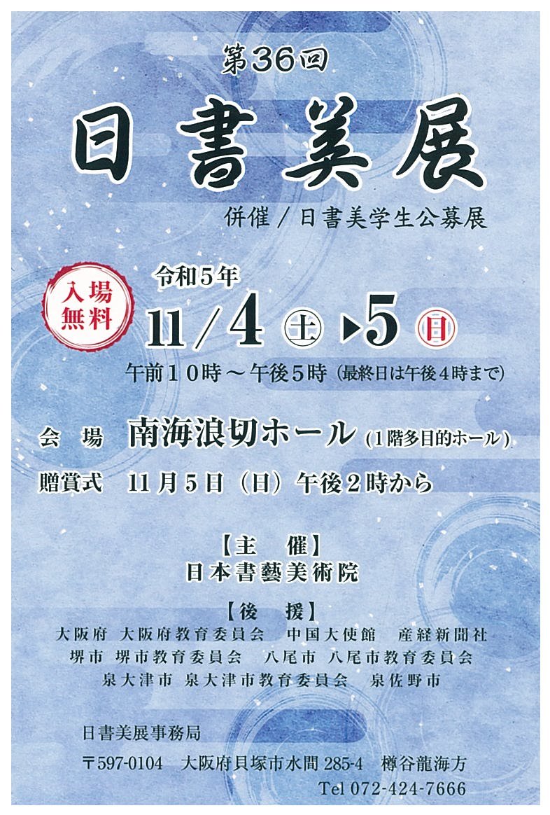 | 展覧会名 会期 会場 団体・代表名 | 第36回日書美展 併催 日書美学生公募展 11月4日(土)~11月5日(日) 南海浪切ホール 日本書藝美術院・中塚龍華 |