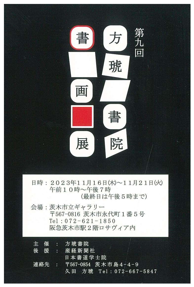 | 展覧会名 会期 会場 団体・代表名 | 第9回方琥書院書画展 11月16日(木)~11月21日(火) 茨木市立ギャラリー 日本書道学士院・久田方琥 |