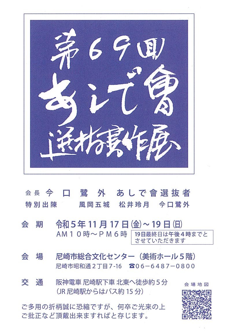 | 展覧会名 会期 会場 団体・代表名 | 第69回あしで會選抜書作展 11月17日(金)~11月19日(日) 尼崎市総合文化センター美術ホール あしで會・今口鷺外 |