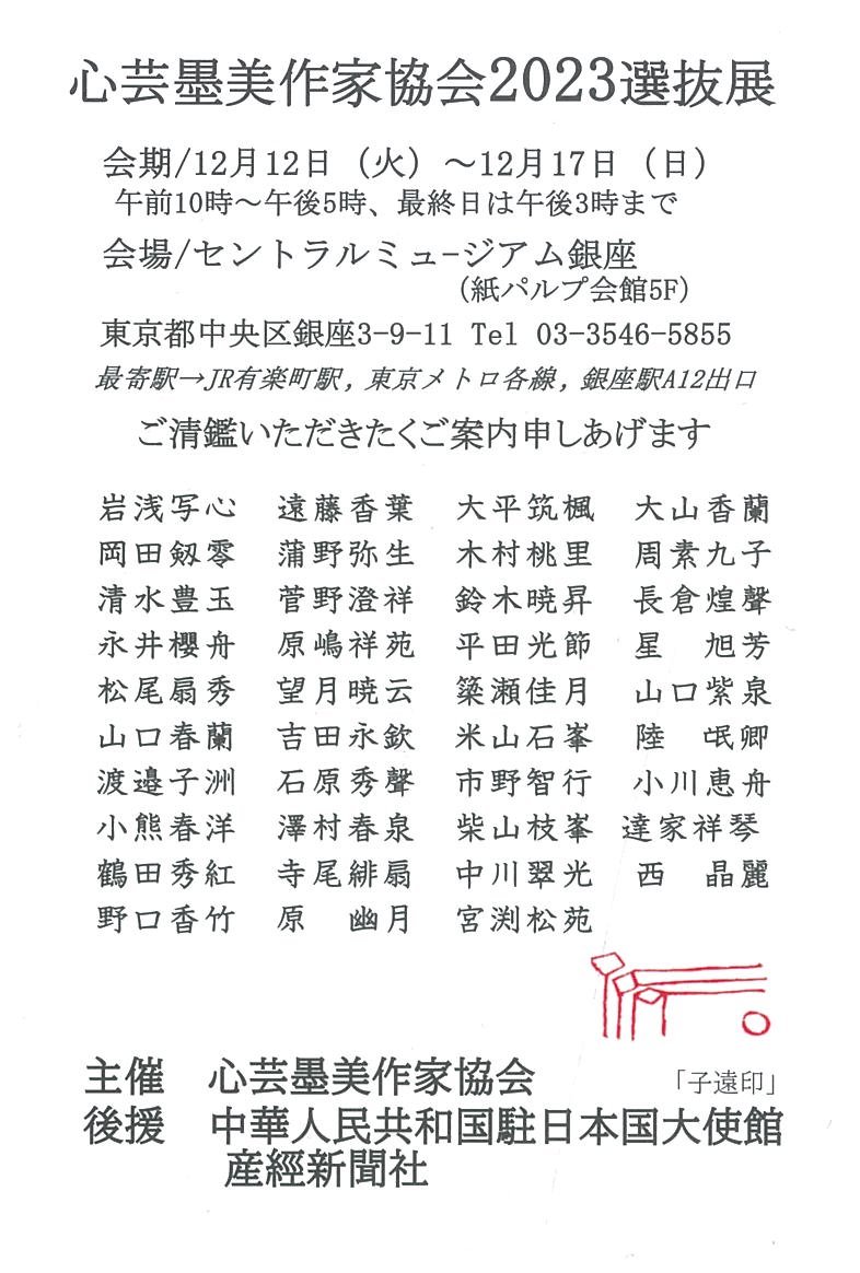 | 展覧会名 会期 会場 団体・代表名 | 心芸墨美作家協会2023選抜展 12月12日(火)~12月17日(日) セントラルミュージアム銀座 心芸墨美作家協会・岩浅写心 |