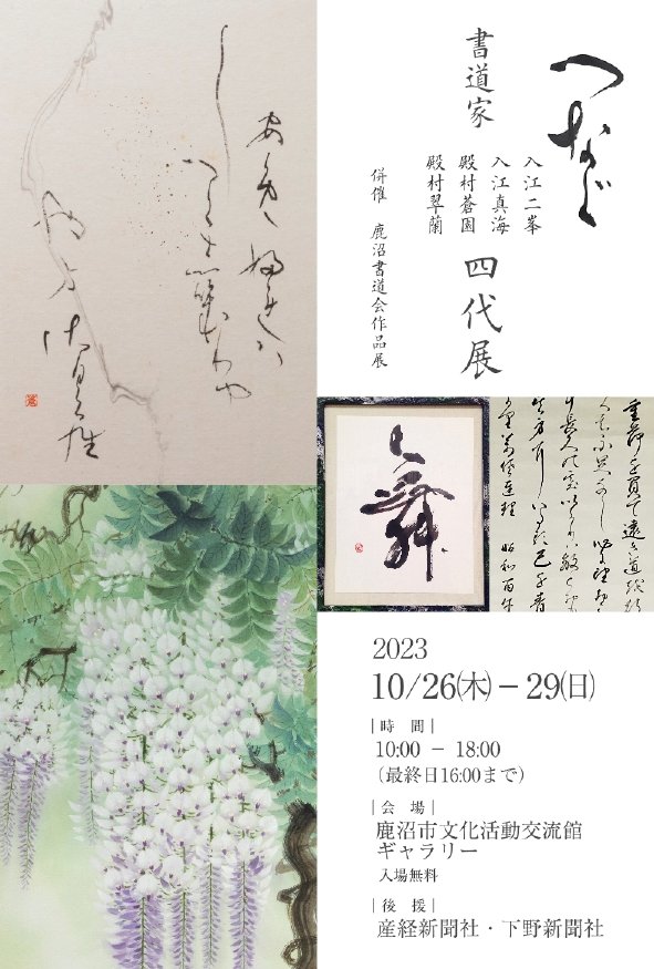 | 展覧会名 会期 会場 団体・代表名 | つなぐ・書道家四代展 併催 鹿沼書道会作品展 10月26日(木)~10月29日(日) 鹿沼市文化活動交流館ギャラリー 鹿沼書道会・殿村蒼園 |