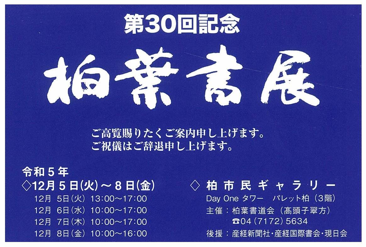 | 展覧会名 会期 会場 団体・代表名 | 第30回記念柏葉書展 12月5日(火)~12月8日(金) 柏市民ギャラリー 柏葉会・髙頭子翠 |