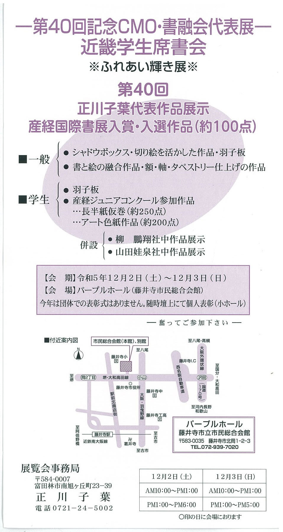 | 展覧会名 会期 会場 団体・代表名 | 第40回記念CMO展・近畿席書大会 12月2日(土)~12月3日(日) 藤井寺市民総合会館 近畿席書会・正川子葉 |