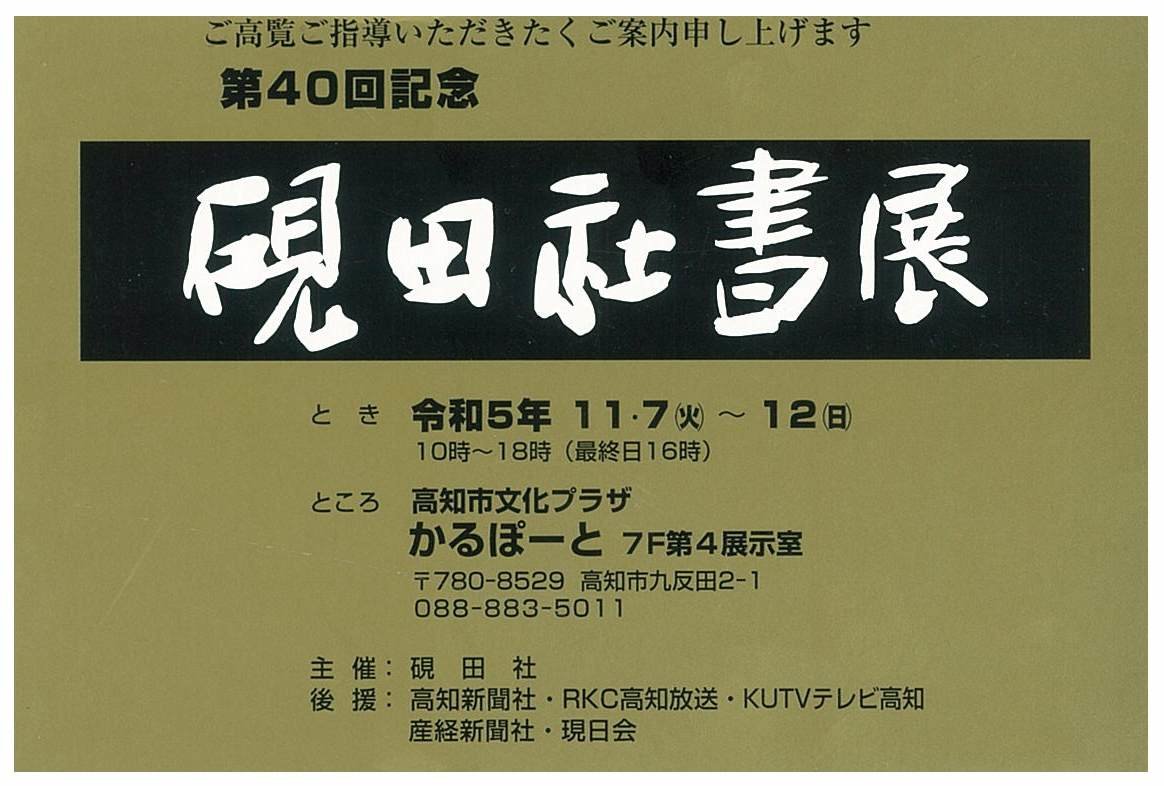 | 展覧会名 会期 会場 団体・代表名 | 第40回記念硯田社書展 11月7日(火)~11月12日(日) 高知市文化プラザかるぽーと 硯田社・橘黄華 |