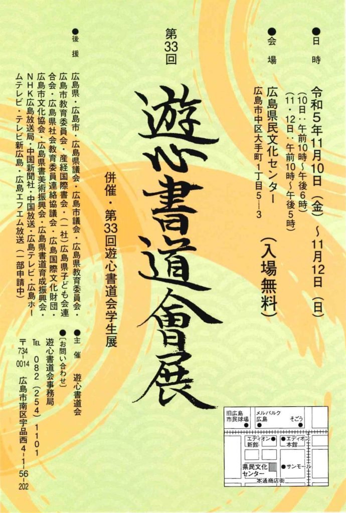 | 展覧会名 会期 会場 団体・代表名 | 第33回遊心書道会展 11月10日(金)~11月12日(日) 広島県民文化センター 遊心書道会・大庭清峰 |