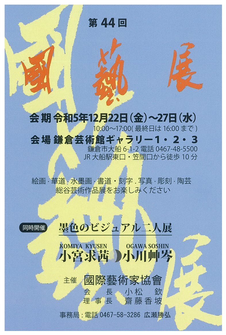 | 展覧会名 会期 会場 団体・代表名 | 第44回國藝展 12月22日(火)~12月27日(水) 鎌倉芸術館ギャラリー 齋藤香坡 |