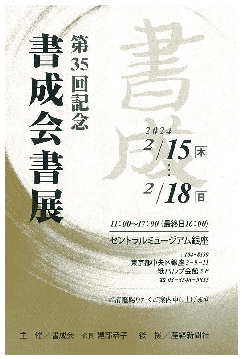 | 展覧会名 会期 会場 団体・代表名 | 第35回記念書成会書展 2月15日(木)~2月18日(日) セントラルミュージアム銀座 書成会・建部恭子 |