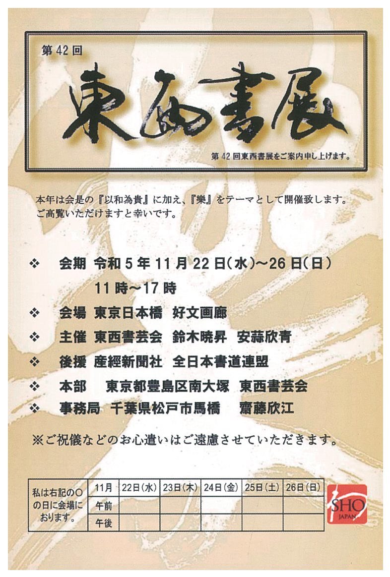 | 展覧会名 会期 会場 団体・代表名 | 第42回東西書展 11月22日(水)~11月26日(日) 日本橋 好文画廊 東西書芸会・鈴木曉昇 |