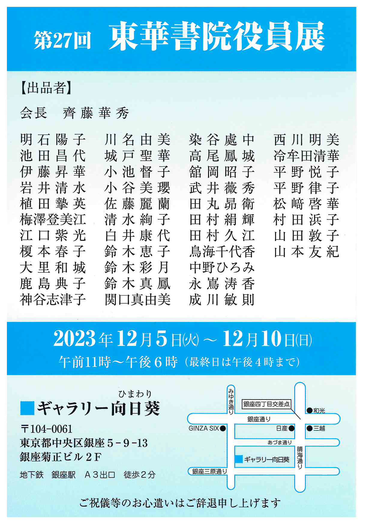 | 展覧会名 会期 会場 団体・代表名 | 第27回東華役員展 12月5日(火)~12月10日(日) ギャラリー向日葵 東華書院・齊藤華秀 |