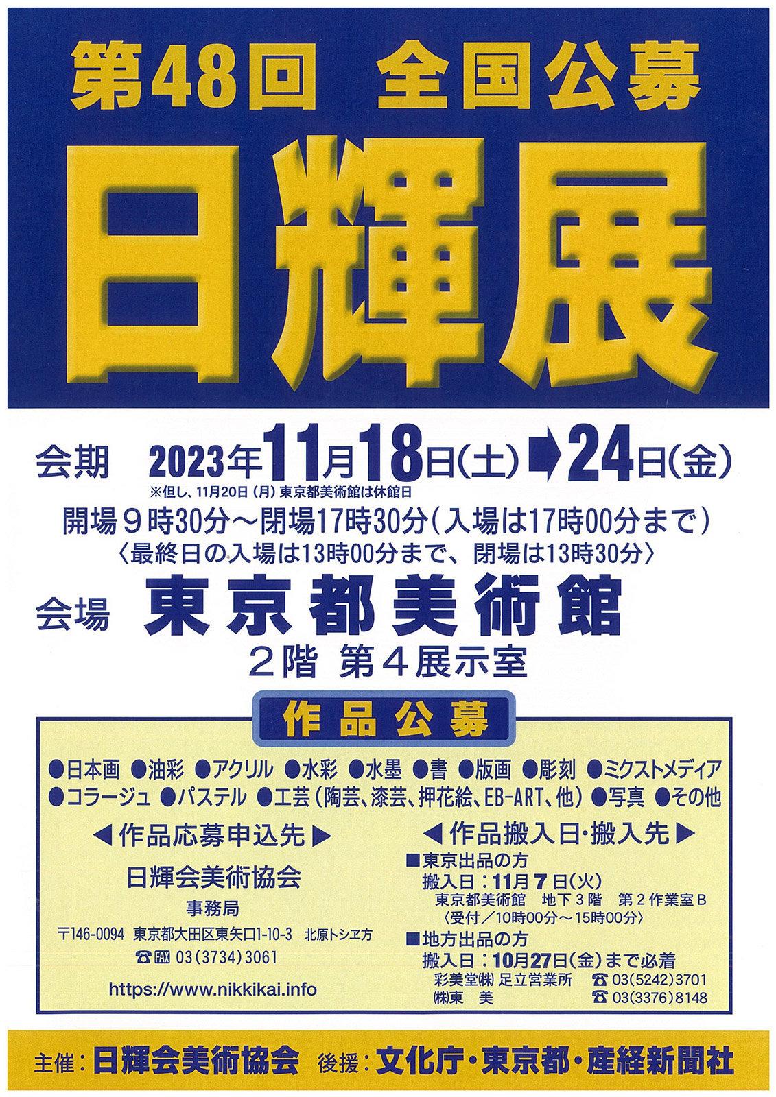 | 展覧会名 会期 会場 団体・代表名 | 第48回全国公募 日輝展 11月18日(土)~11月24日(金) 東京都美術館 日輝会美術協会・石井理春 |