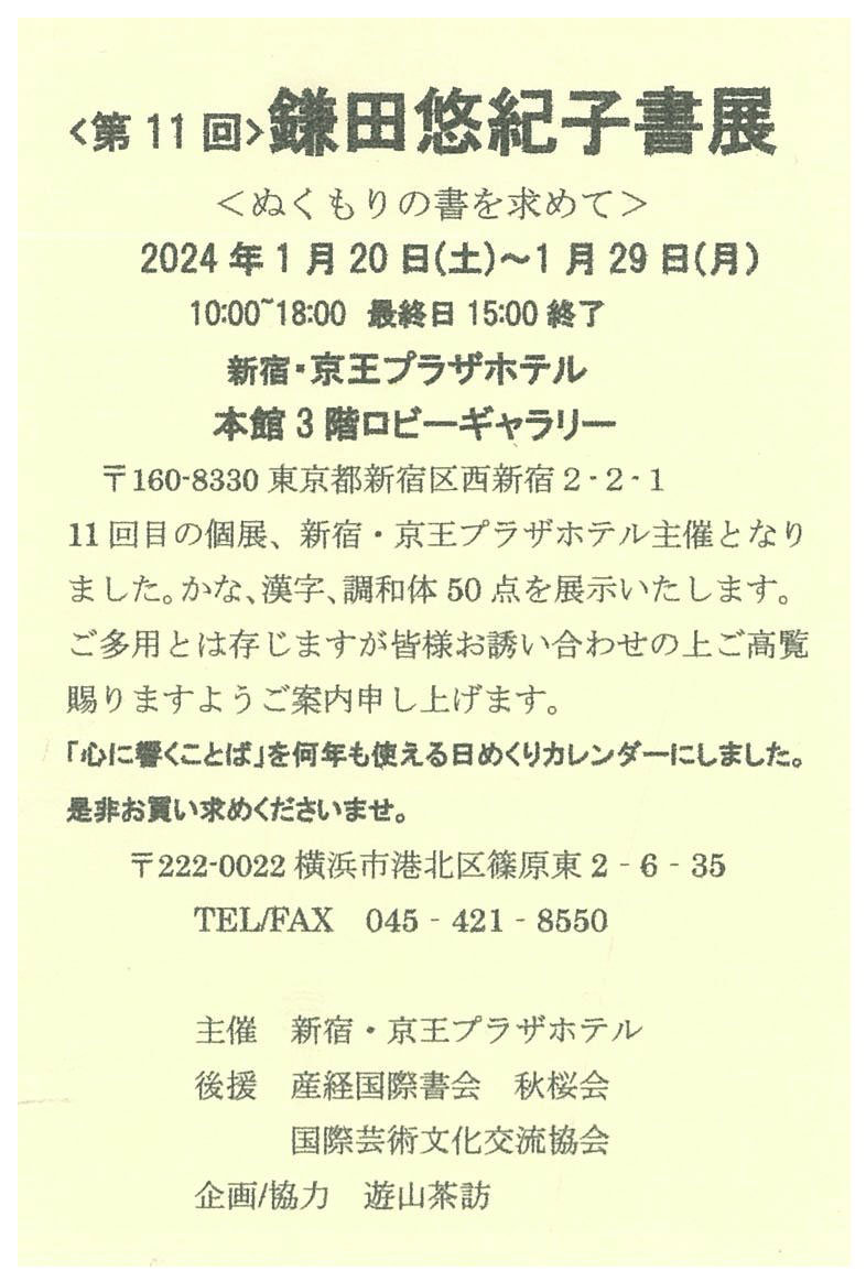 | 展覧会名 会期 会場 団体・代表名 | 第11回鎌田悠紀子書展 <ぬくもりの書を求めて> 1月20日(土)~1月29日(月) 京王プラザホテル1Fロビー、B1ギャラリー 鎌田悠紀子 |