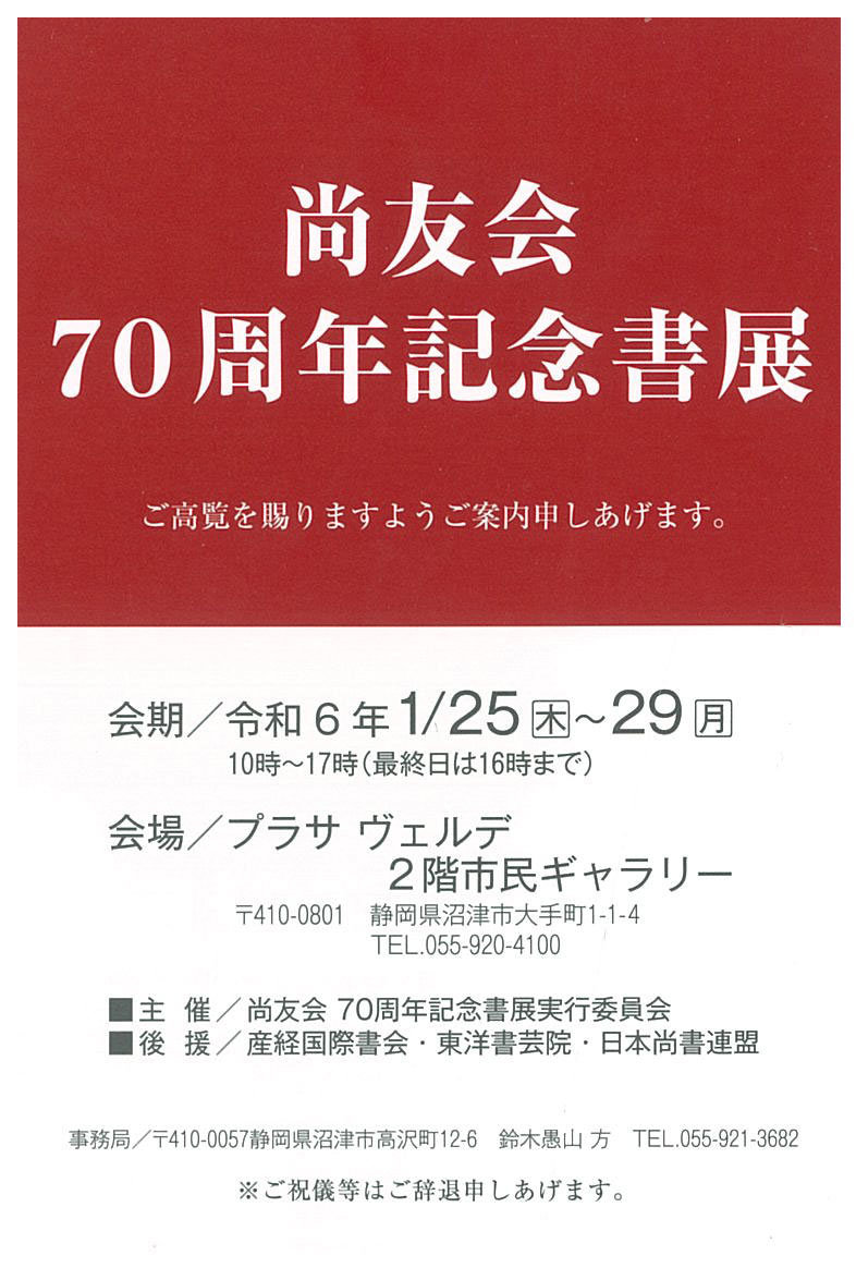 | 展覧会名 会期 会場 団体・代表名 | 尚友会70周年記念書展 1月25日(木)~1月29日(月) プラザヴェルデ「キラメッセぬまづ」市民ギャラリー 尚友会・小杉修史 |