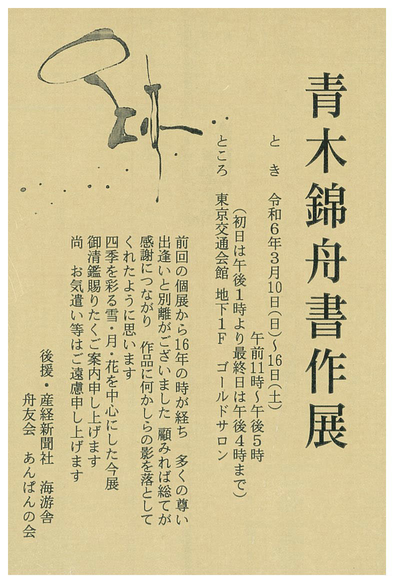 | 展覧会名 会期 会場 団体・代表名 | 青木錦舟書作展 3月10日(日)~3月16日(土) 東京交通会館ゴールドサロン 青木錦舟 |