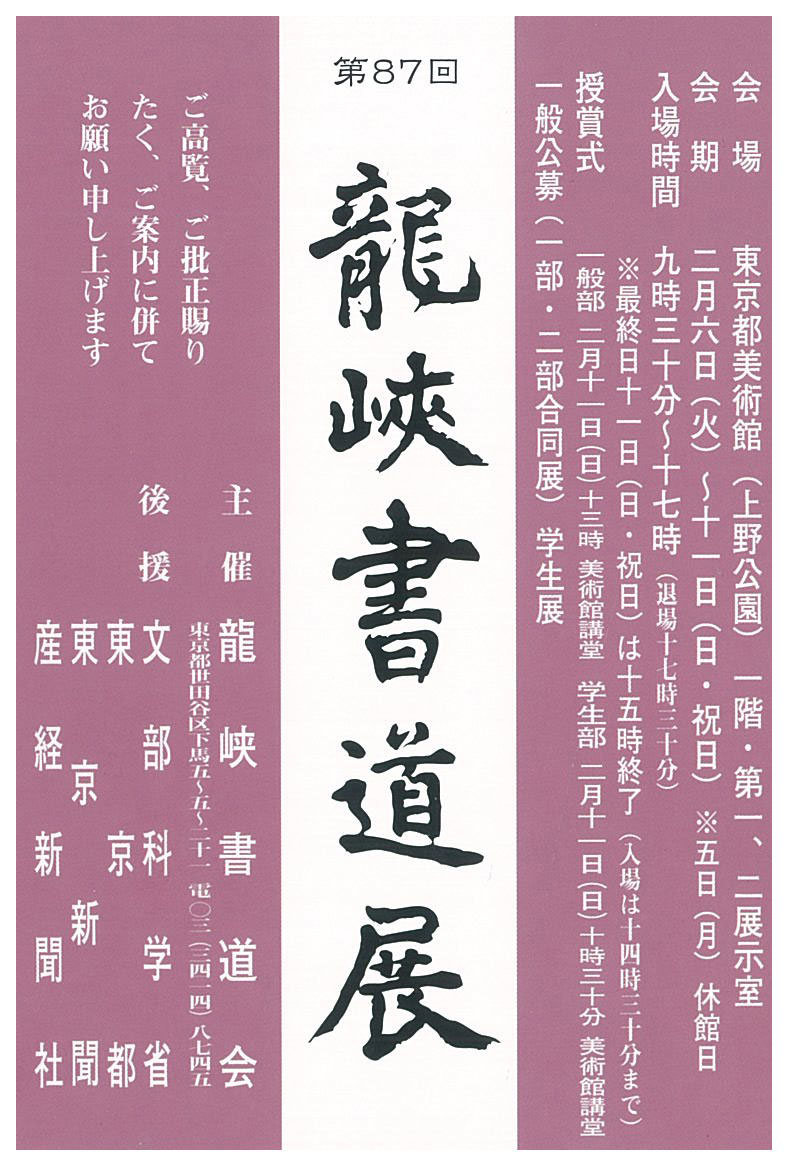 | 展覧会名 会期 会場 団体・代表名 | 第87回龍峡書道会 2月6日(火)~2月11日(日) 東京都美術館 龍峡書道会・林龍成 |