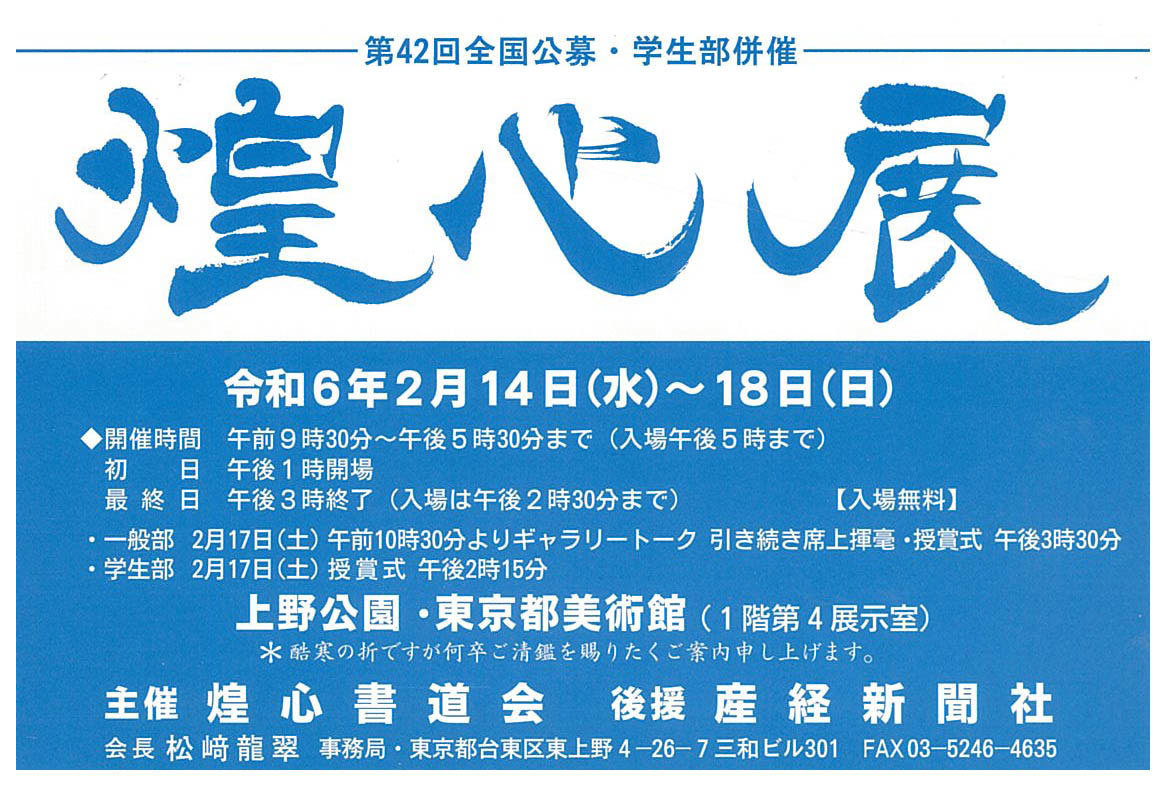 | 展覧会名 会期 会場 団体・代表名 | 第42回全国公募・学生部併催煌心展 2月14日(水)~2月18日(日) 東京都美術館 煌心書道会・松﨑龍翠 |