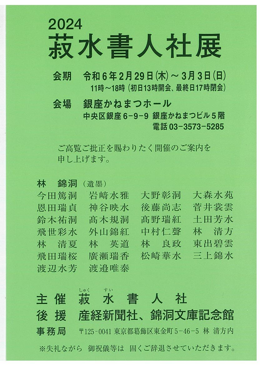 | 展覧会名 会期 会場 団体・代表名 | 2024菽水書人社展 2月29日(木)~3月3日(日) 銀座かねまつホール 菽水書人社・林清方 |