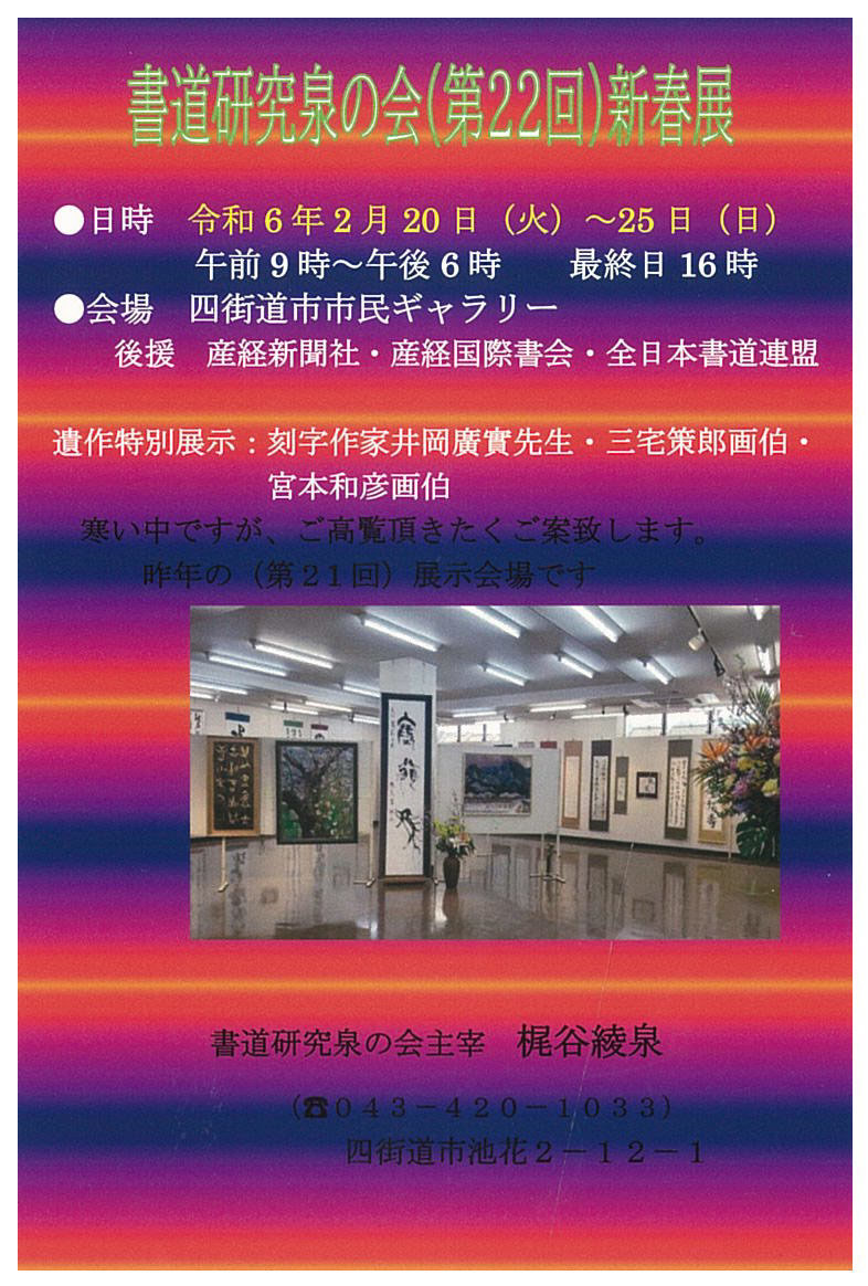 | 展覧会名 会期 会場 団体・代表名 | 書道研究泉の会(第22回)新春展 2月20日(火)~2月25日(日) 四街道市市民ギャラリー 泉の会・梶谷綾泉 |