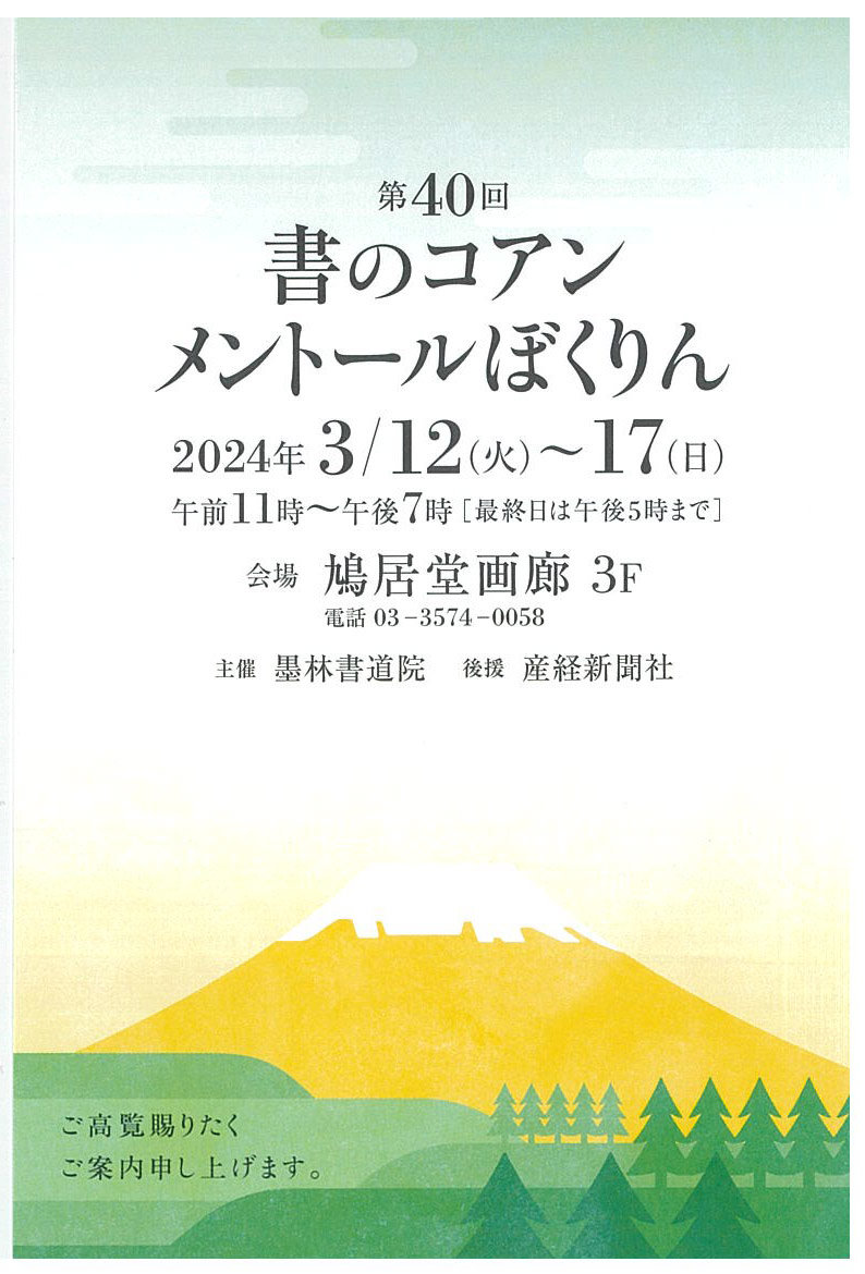 | 展覧会名 会期 会場 団体・代表名 | 第40回書のコアン メントールぼくりん 3月12日(火)~3月17日(日) 鳩居堂画廊3階 墨林書道院 |