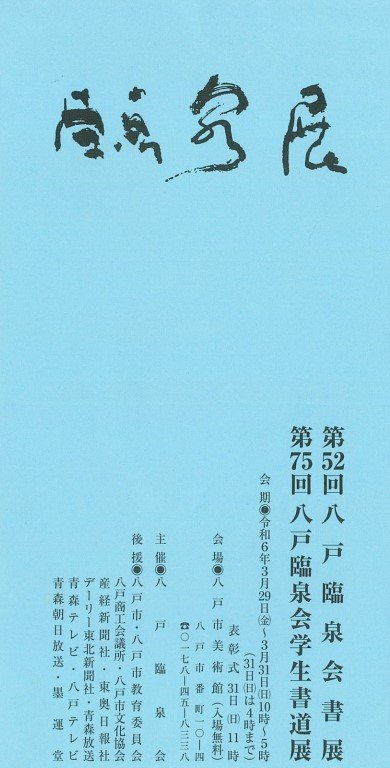 | 展覧会名 会期 会場 団体・代表名 | 第52回八戸臨泉会書展・第75回八戸臨泉会学生書道展 3月29日(金)~3月31日(日) 八戸市美術館 八戸臨泉会・原田圭泉 |