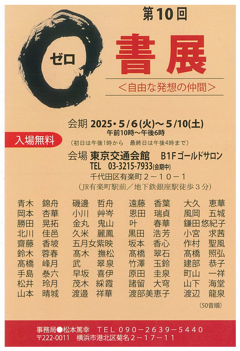 | 展覧会名 会期 会場 団体・代表名 | 第10回ゼロ書展 <自由な発想の仲間> 5月6日(火)~5月10日(土) 東京・東京交通会館 ゴールドサロン ゼロ書展運営委員会・松本篤幸 |