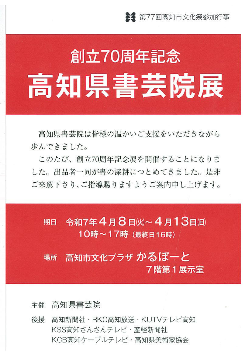 | 展覧会名 会期 会場 団体・代表名 | 高知県書芸院 創立70周年記念展 4月8日(火)~4月13日(日) 高知・高知市文化プラザかるぽーと 高知県書芸院・楠瀬昭峰 |