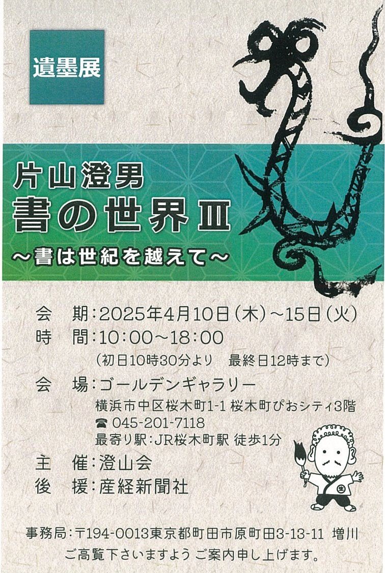 | 展覧会名 会期 会場 団体・代表名 | 遺墨展 片山澄男 書の世界III 4月10日(木)~4月15日(火) 神奈川・桜木町ぴおシティ 澄山会・増川知子 |