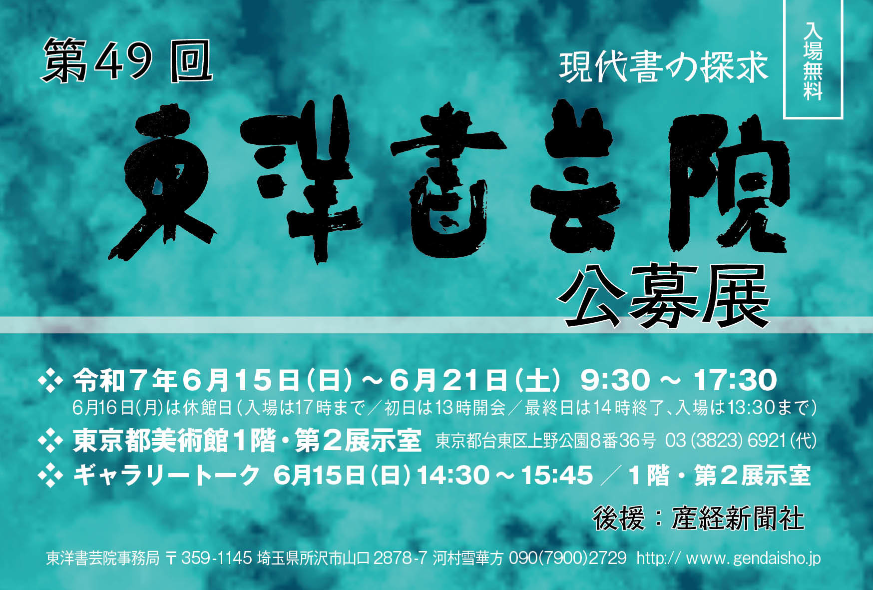 | 展覧会名 会期 会場 団体・代表名 | 第49回東洋書芸院公募展 6月15日(日)~6月21日(土) 東京・東京都美術館 東洋書芸院・朝比奈玄甫 |