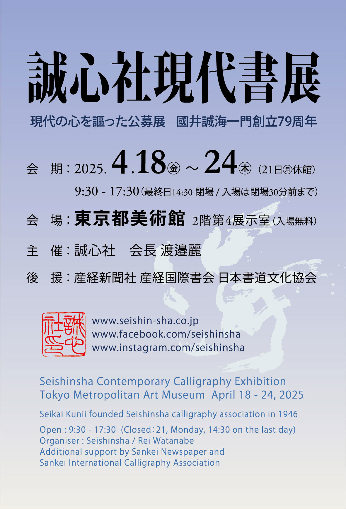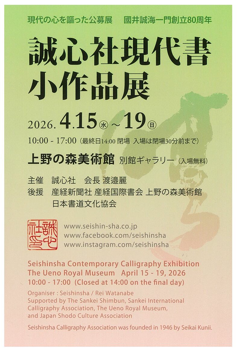 | 展覧会名 会期 会場 団体・代表名 | 誠心社現代書小作品展―國井誠海一門創立80周年― 4月15日 (水)~ 4月19日 (日) 上野の森美術館 ギャラリー 誠心社・渡邉麗 |