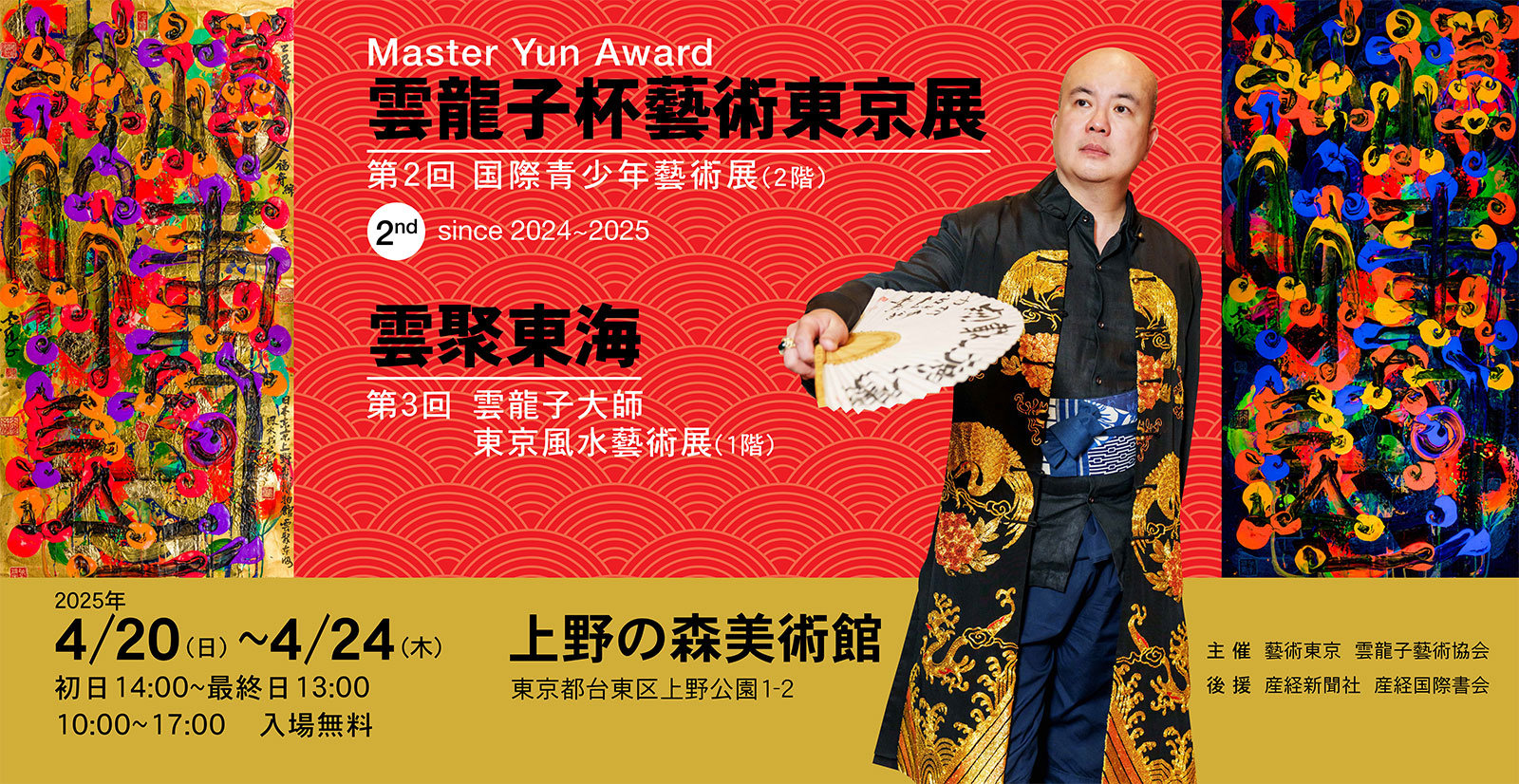 | 展覧会名 会期 会場 団体・代表名 | 第2回 雲龍子杯 藝術東京展・国際青少年藝術展 第3回 雲聚東海 雲龍子大師 東京風水藝術展 4月20日(日)~4月24日(木) 東京・上野の森美術館 雲龍子芸術協会 ・雲龍子、藝術東京・常常 |