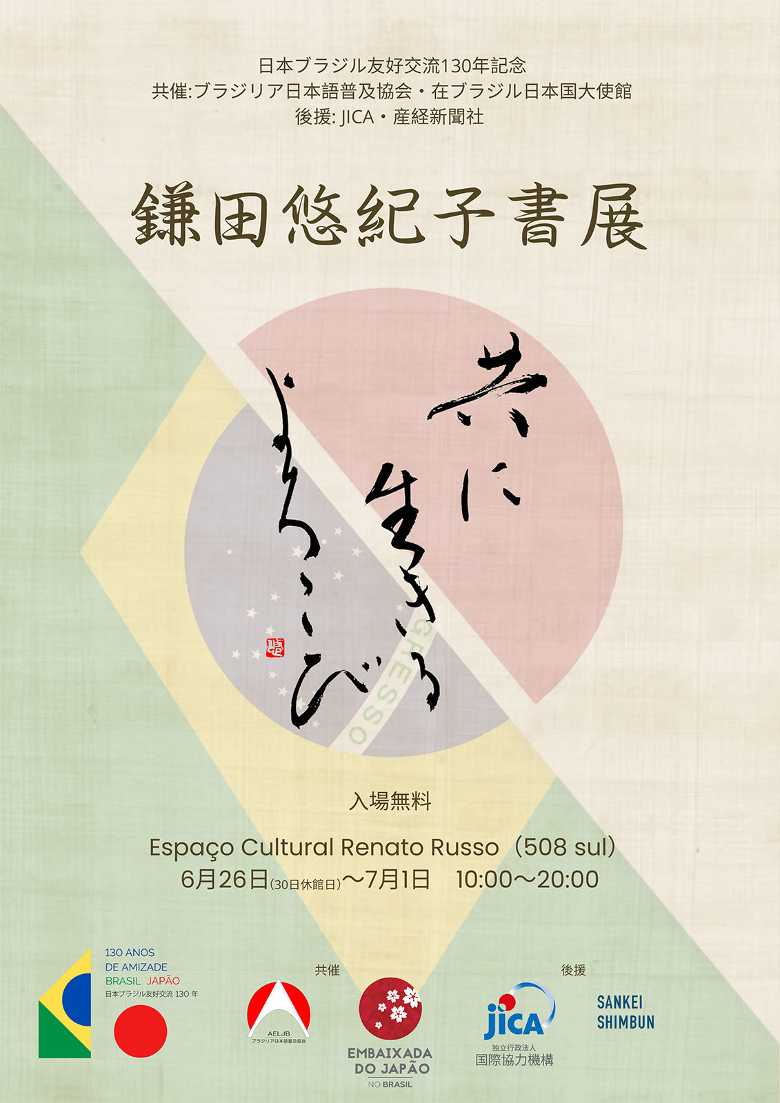 | 展覧会名 会期 会場 団体・代表名 | 日本ブラジル友好交流130年 鎌田悠紀子書展 6月26日(木)~7月2日(水) ブラジリア・レナート・ルッソ 文化イベント展示場 秋桜会・鎌田悠紀子 |